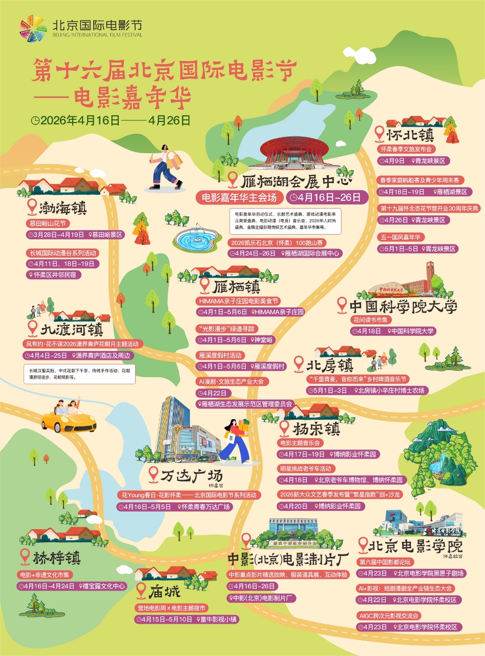 电影节期间,怀柔区将开展“影人沉浸式体验”“文旅打卡种草”系列推介活动,邀请影人、歌手走进怀柔科学城城市客厅、慕田峪长城景区等点位,带领市民共享怀山柔水之美。童牛影视小镇“营地电影周+电影主题夜市”将持续至5月10日,电影手作工坊、DIY体验区、电影声音剧场等互动项目,让游客化身“剧中人”。禧宝露文化中心结合公益电影放映,打造非遗文化市集,观影、体验、展卖一站式体验持续至4月24日。